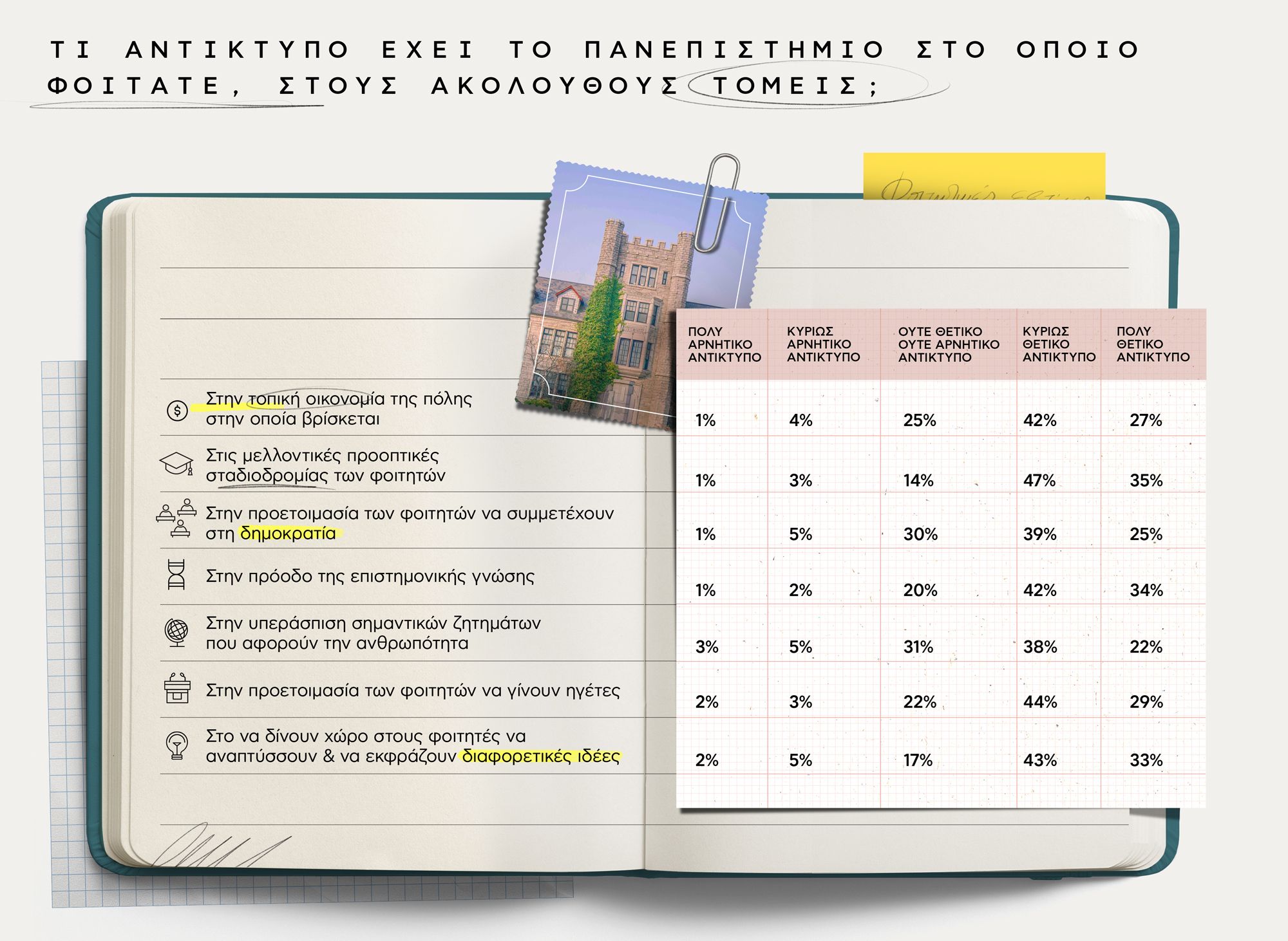 Στο ίδιο πνεύμα, οι ερωτηθέντες φαίνεται να είναι πολύ ή σχετικά ικανοποιημένοι από την ικανότητα του πανεπιστημίου τους να τους παρέχει διδακτική καθοδήγηση (78%) και τις δεξιότητες που είναι απαραίτητες για την εισαγωγή τους στο σύγχρονο εργατικό δυναμικό (76%). Ωστόσο, όσον αφορά την προετοιμασία των φοιτητών να συμμετάσχουν στη δημοκρατία, το ποσοστό πέφτει στο 61%, αναδεικνύοντας την προσδοκία τους ότι τα ακαδημαϊκά ιδρύματα θα πρέπει να καταβάλλουν μεγαλύτερες προσπάθειες για την καλλιέργεια της πολιτικής αγωγής και της συμμετοχής των πολιτών στα κοινά.